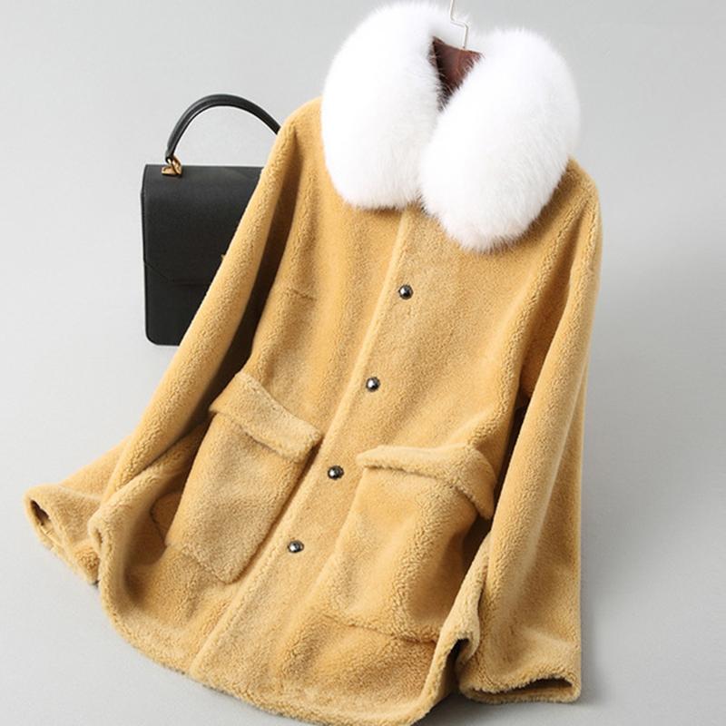 2019 Autumn Winter Natural Sheep Shearing Fur Coat Elegant Short Warm Overcoat with Real Fox Fur Collar Winter Jacket Women A040